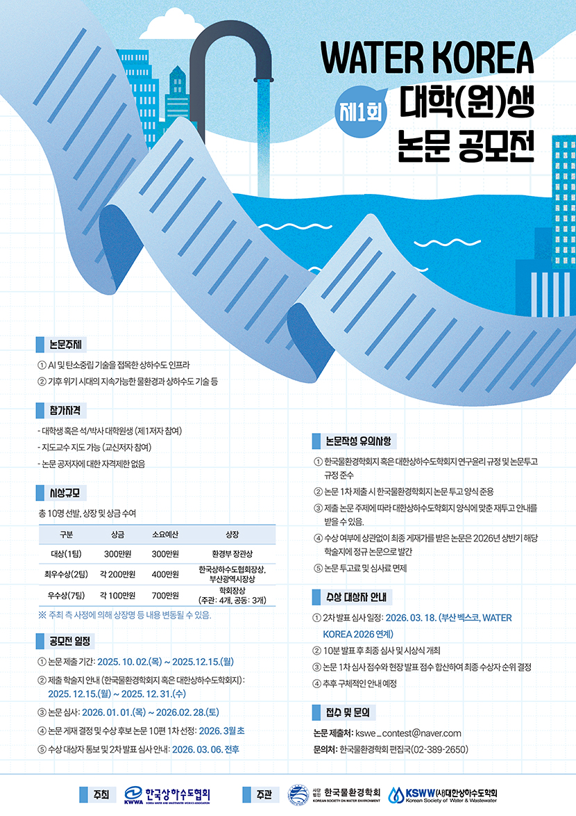 #한국상하수도협회 #한국물환경학회 #대한상하수도학회 #상하수도인프라 #논문공모전 #환경공모전