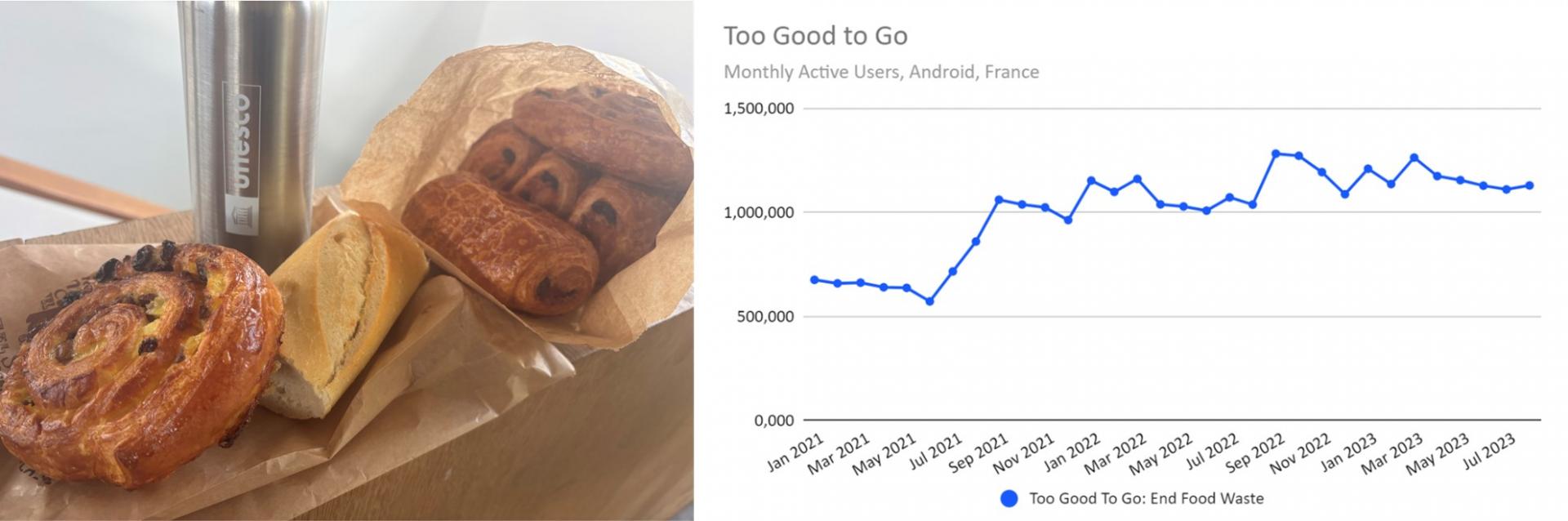 ▲ 그림4. (좌) 투 굿 투 고(Too Good To Go)’를 통해 2.99유로에 구매한 빵과 (우) 프랑스 안드로이드 월간 활성 이용자 수 추이