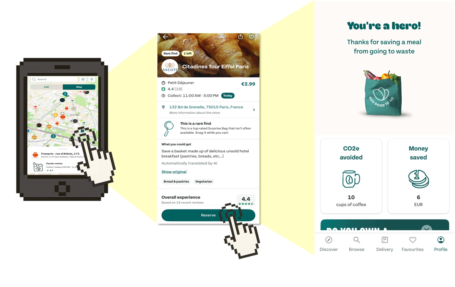 ▲ 그림3. 투 굿 투 고(Too Good To Go) 사용 방법 예시 (매장 검색, 상품 예약, 구매 후 환경·경제적 효과를 확인하는 모습)