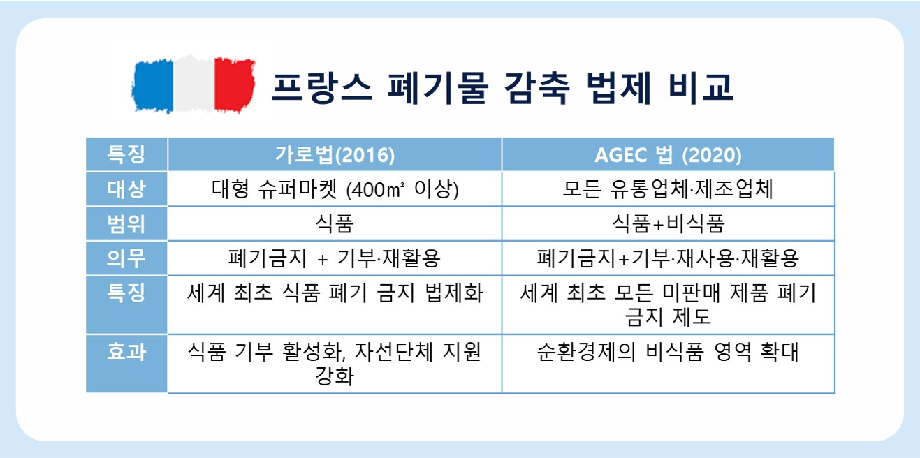 프랑스는 순환경제를 단순한 구호가 아닌 법적 의무로 만든 선구적 사례이다. 2016년 제정된 '가로 법(Loi Garot)'은 대형 슈퍼마켓이 아직 먹을 수 있는 식품을 폐기하지 못하도록 금지하고, 이를 기부하거나 재활용하도록 의무화했다.